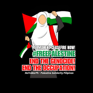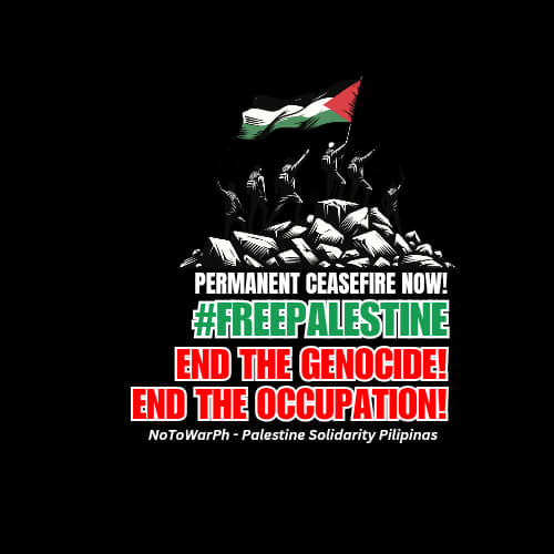 Kasangkapanin natin ang lahat ng porma at paraan sa paghahayag ng panawagang Ceasefire- upang tugunan ang emerhensyang kalagayan ng mga sibilyang apektado; Palayain ang Palestina; at wakasan ang pang-ookupa bansang Israel sa teritoryo ng Palestina.