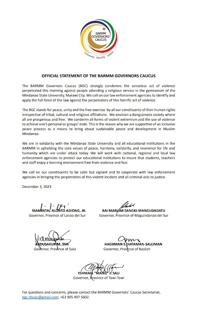 BGC's Official Statement on the Marawi Bombing Incident on December 04, 2023 Get link Facebook X Pinterest Email Other Apps Source: BARMM Governor's Caucus - Sulu Comments